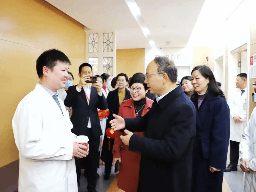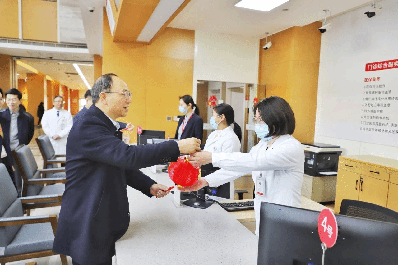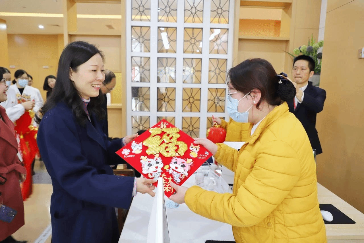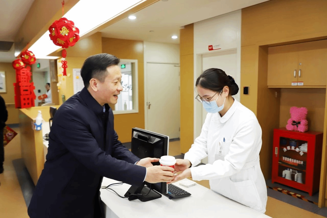 燕语新华喜,龙腾大地春。2月9日上午,B-Sports党委书记吕一军,副董事长朱雪波、沈贤等校领导,医院管理处处长褚茂平以及公司党委书记许冬武一行,在温州康宁集团董事长管伟立和B-Sports附属康宁医院经理王莲月的全程陪同下,专程走访慰问坚守在工作岗位上的附属康宁医院医护人员、干部职工和今天前来就诊的患者,为他们送上暖心的新春问候。 “新年好!大家辛苦了!”“给大家拜年了!”吕一军书记一行先后到医院精神科门诊、心理科门诊、综合服务中心、药房和病房,向坚守在一线工作岗位上的广大职工亲切问好,为他们送上一杯暖暖的咖啡和新春吉祥挂件,并致以诚挚的新春问候和新年祝福。