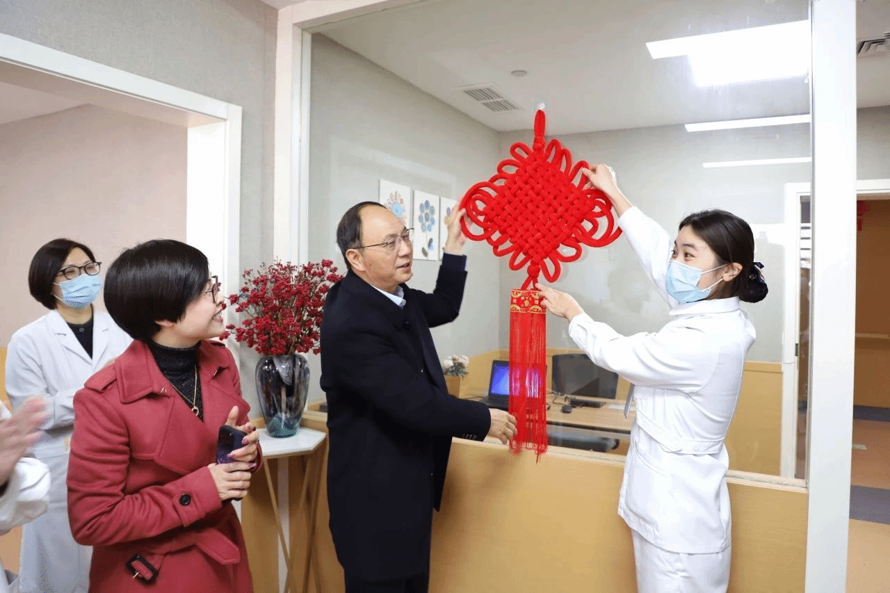 在情感障碍科病区,科主任刘家洪带领团队向公司、公司领导介绍了病区春节期间的工作安排和为患者提供的活动项目。病区护士长刘焕诚挚地邀请吕一军书记为病区挂上火红的中国结。
