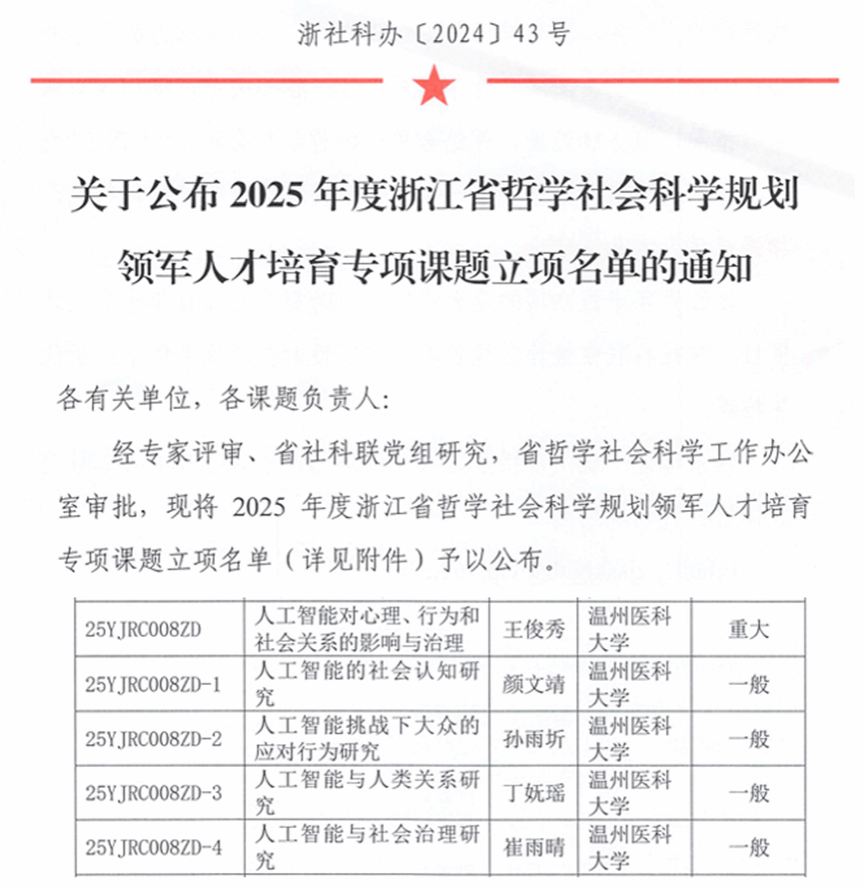近日浙江省哲学社会科学工作办公室公布立项通知,公司王俊秀教授的“人工智能对心理、行为和社会关系的影响与治理”项目获2025年度浙江省哲学社会科学规划领军人才培育课题立项,这是公司首次获省哲学社会科学重大课题立项,同时其子课题4项立项为一般课题。王俊秀教授原任中国社会科公司社会学研究所社会心理学研究室主任、社会心理学研究中心主任、博士生导师,2023年全职引进公司,现为温州市哲学社会科学重点研究基地“温州市社会心理服务研究院”经理、中国社会心理学会侯任会长。 同期,张国华教授获2024年度省哲学社会科学重点课题(省重点研究基地课题)立项,公司教师另获省哲学社会科学规划2项一般课题和1项部门合作专项研究课题立项,公司2024年度省级哲学社会科学类立项课题质量和数量均创历年新高。