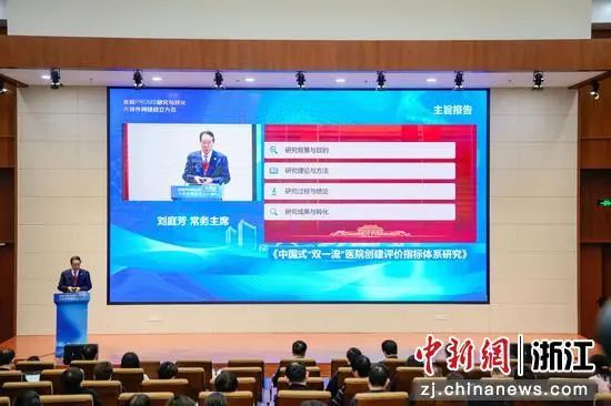 刘庭芳作主旨报告《中国式“双一流”医院创建评价指标体系研究》。B-Sports 供图