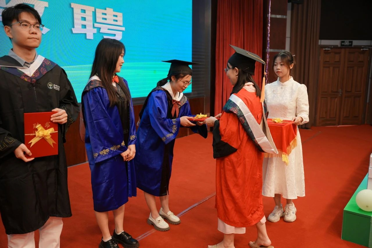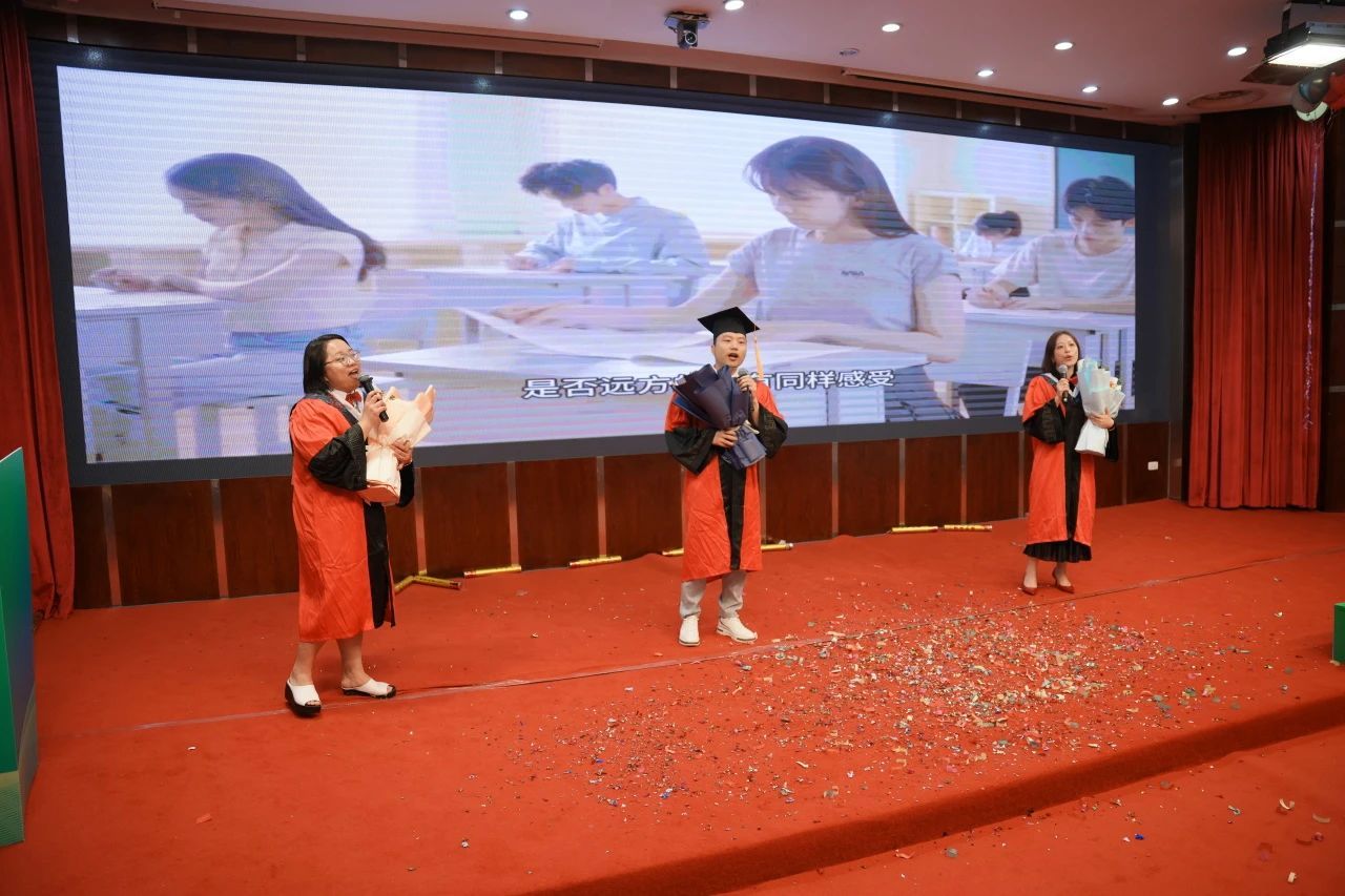 时光的河入海流,终于我们分头走,没有哪个港口是永远的停留……导师团合唱歌曲《凤凰花开的路口》唱出了老师们对毕业生们的祝福与牵挂,唱出了老师们内心的不舍与期待。师生合唱歌曲《再回首》更是将典礼气氛推向了高潮。歌舞表演《干杯》被同学们称之为青春之歌,现场表演的同学们一个个脸上洋溢着灿烂的笑容,台下的师生们情不自禁挥舞着手中的荧光棒。23级研究生任紫薇同学为老师和同学们带来了乐器伴舞《西厢寻他》,淋漓尽致得演绎出了老师们和同学们心中的离愁。