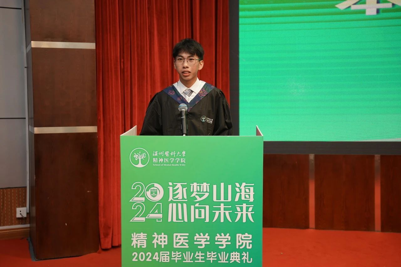 本科毕业生代表石竹同学回顾大学5年有幸见证了建国70周年、建党百年、公司建院5周年等,感叹何其有幸生逢盛世。他提到实习时一位非常期待回家的病人使他意识到病人与医生本质相通,都是普通人,需要互相关心和理解;这也使他更加坚定了自己的使命和信念,那就是秉持医者仁心,成为精神卫生事业的守护者。