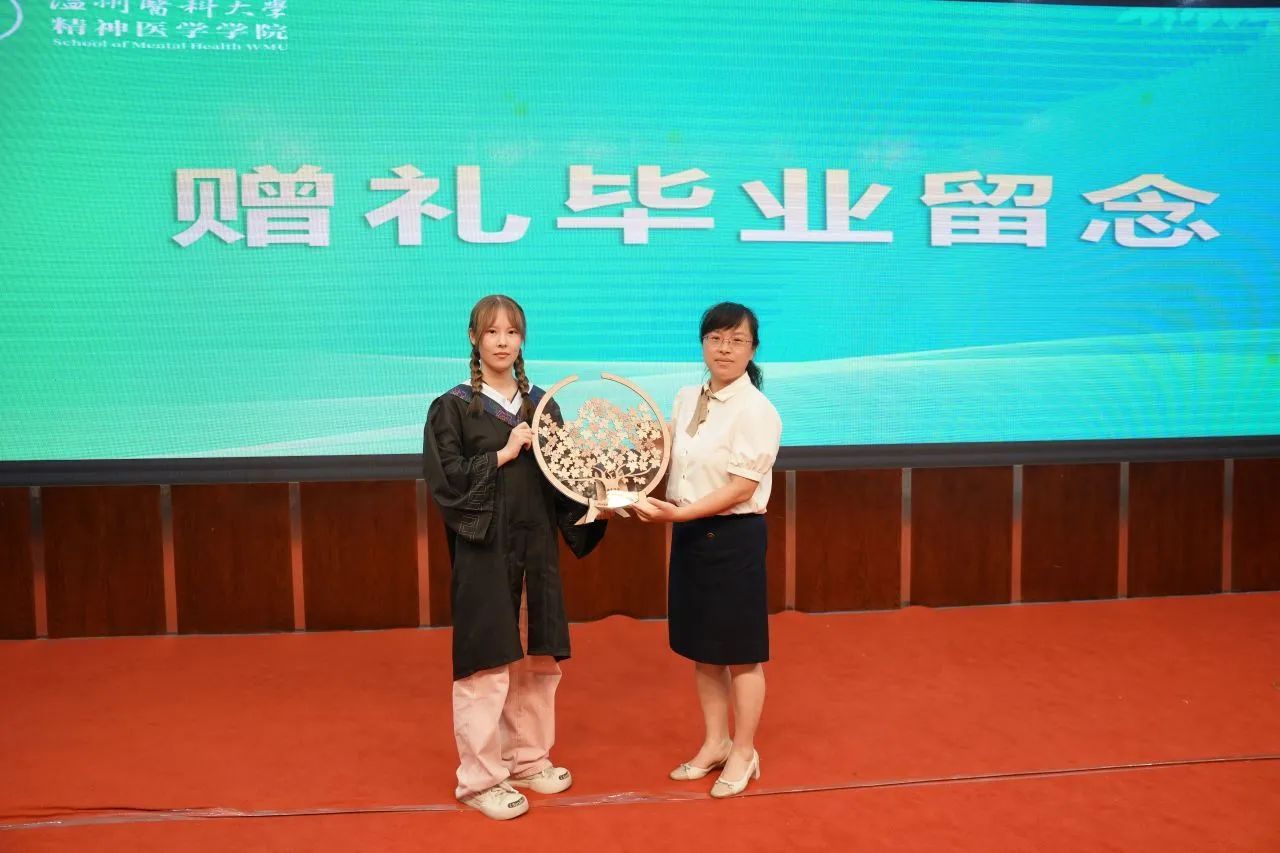 毕业典礼上,公司、医院与毕业生之间互赠了纪念品,以实物承载这份深厚的情谊和美好的祝愿。公司党委副书记涂艳玲接受了毕业生们为公司准备的礼物——祝福树,表达了毕业生们对公司的美好祝愿以及最深切的致敬。同学们也为医院准备了锦旗 ,“情系教育 惟宏隆德”八个大字是同学们对温州康宁医院多年来给予支持的感谢。温州康宁医公司党委副书记徐谊为毕业生们赠送了纪念品--定制充电宝,希望同学们在失落时可以续航充电充满正能量。