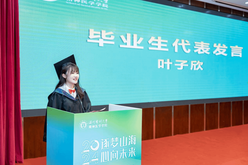 参加新生团辅、心理微电影比赛、心理嘉年华活动、关爱阿尔茨海默老人志愿服务活动……毕业生代表叶子欣回顾了在大公司园里的点点滴滴。成功考上研究生的她选择成为第26届研究生支教团的西部青年志愿者,她表示会努力将个人理想融入党和国家事业中,致力于将心理赋能于社会服务、乡村振兴,成为具有医学底蕴和心理人文关怀的时代新人。