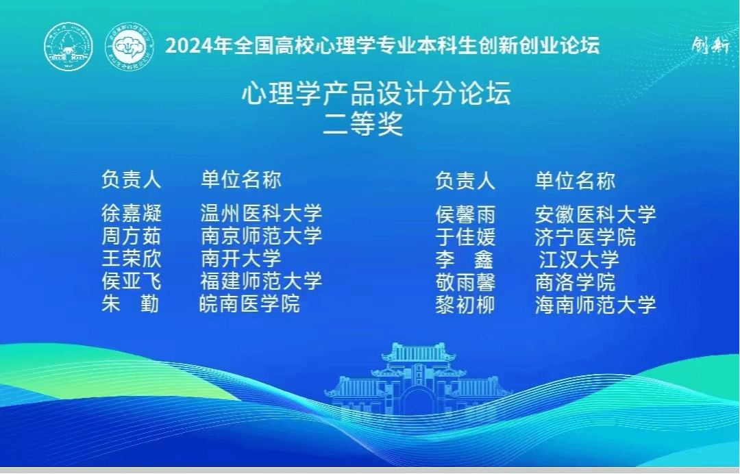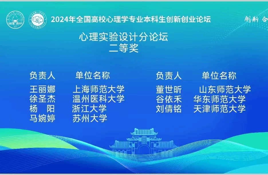 2024年5月2日,由教育部高等公司心理学类专业教学指导委员会主办的2024年全国高校心理学专业本科生创新创业论坛现场展示在广西师范大学育才校区圆满举行。公司应用心理学专业本科生徐圣杰同学,徐嘉凝同学(及其团队),在指导老师孙雨圻的带领下,经过激烈角逐,荣获心理学实验设计分论坛二等奖,心理学产品设计分论坛二等奖的佳绩!