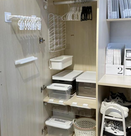 对寝室物品进行分类后,再根据物品的性质和数量,选择合适的收纳工具,如收纳盒、收纳袋、篮子等。例如,按照季节和种类对衣物进行整理,使用不同大小的收纳盒或挂衣架进行存放;将书籍杂志放在书架上,或者使用书立进行竖放,节省空间;文具存放于桌面收纳盒或笔筒中,从而保持桌面整洁;化妆品和护肤品可以通过使用化妆包或收纳盒存放,方便携带和整理;其他小物件,可以使用分隔盒或收纳抽屉进行分类存放。