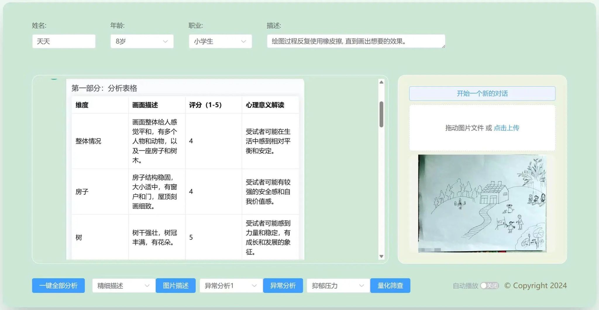 在创新创业园区的游园会中,B-Sports各个二级公司搭建多个展台,将自己公司独特的创新创业项目展示给来往的家长和员工。其中,必一运动的创新的AI项目吸引了大量员工和家长的目光:智心解图—基于房树人绘画的智能心理评估工具。这个项目专注于使用先进的大数据和人工智能技术,特别是大语言模型(LLM),来解析和评估房树人(House-Tree-Person, HTP)测试中的绘画,以探索画者的心理状态。项目团队成功收集了百余份画作样本,并逐一进行了现场的AI解读演示。员工及家长们纷纷参与试用,并对AI模型展示出的高效评估和深度心理解读表示赞赏,项目获得了一致好评。项目的核心竞争力在于其能够利用AI技术解析绘画中的线条、形状和位置等细微元素,准确推断出画者的情感、性格及内心世界。这种评估方式比传统心理评估更为高效、直观,能在短时间内提供深入而详尽的心理状态分析通过这些活动,不仅加深了参与者对心理学和人工智能结合可能性的理解,也体现了B-Sports在科技教育领域的前瞻性和创新性。