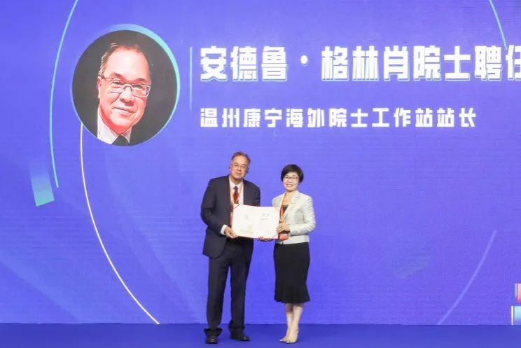 为安德鲁·格林肖院士(左)颁发聘书
