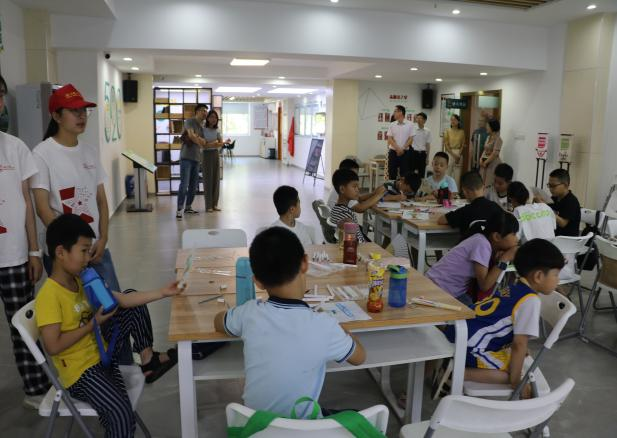 金胜威副董事长一行人在实践团成员的带领下,首先来到瓯海区三垟街道“520榕心之家”,参观了实践服务中心的活动场地与设施,近距离了解了实践团举办的“向日葵”夏令营日常心理课程和活动,并对现场“房树人”特色课程给予肯定。
