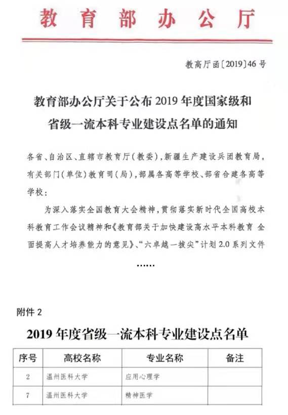 2020年1月,教育部办公室厅公布一流本科专业建设点名单,必一运动应用心理学专业和精神医学专业成为省级一流本科专业建设点。应用心理学专业创办于2001年,2017年获批省“十三五”新兴特色专业,是浙江省唯一以临床心理学为特色方向的心理学类专业;精神医学专业创办于2016年,发挥校企合作、协同育人的机制优势,高起点国际化培养国家紧缺的精神医学卓越人才,四年间迅速发展,在国内同类专业中名列前茅。