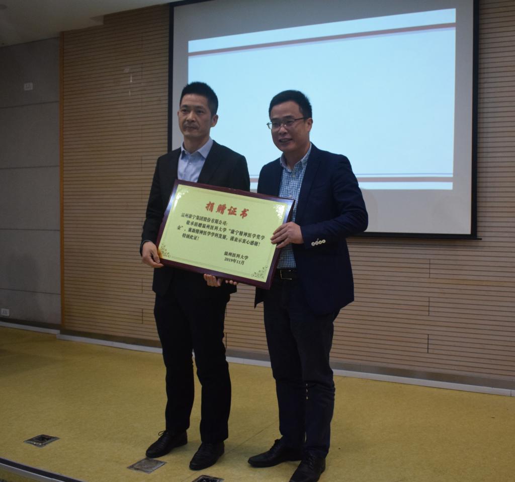 陈乃车代表公司向温州康宁医院颁发捐赠荣誉证书。温州康宁医院副经理、人力资源总监许宁分别向获得奖学金的同学颁发荣誉证书。