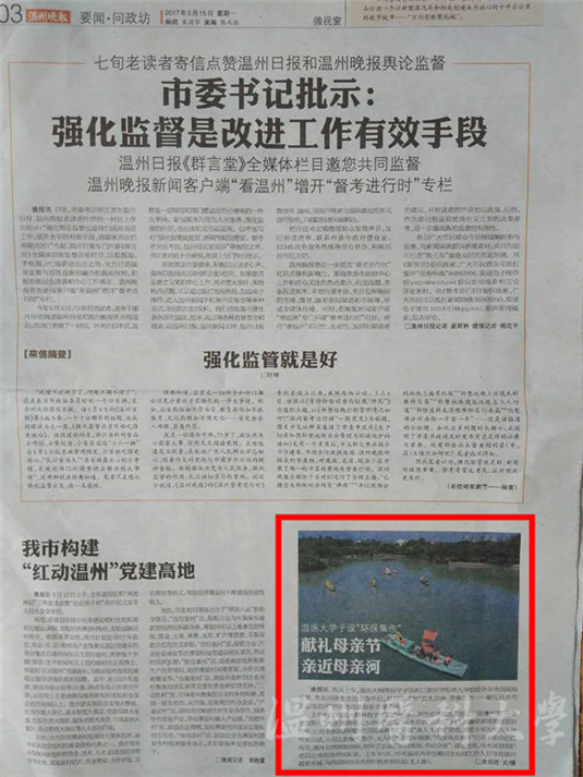 温州晚报讯 昨天上午,温医大必一运动和口腔医公司两大公司联合共青团瓯海区委、生态园管会团委等单位,组织了题为“五水共治 青春助力——礼献母亲节 亲近母亲河”的青年志愿服务主题活动。