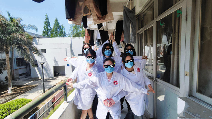 5#203:专业的着装和行为与日常的场景和姿势碰撞,展现医员工的想象力与解压方式,传递青春版的医学浪漫。