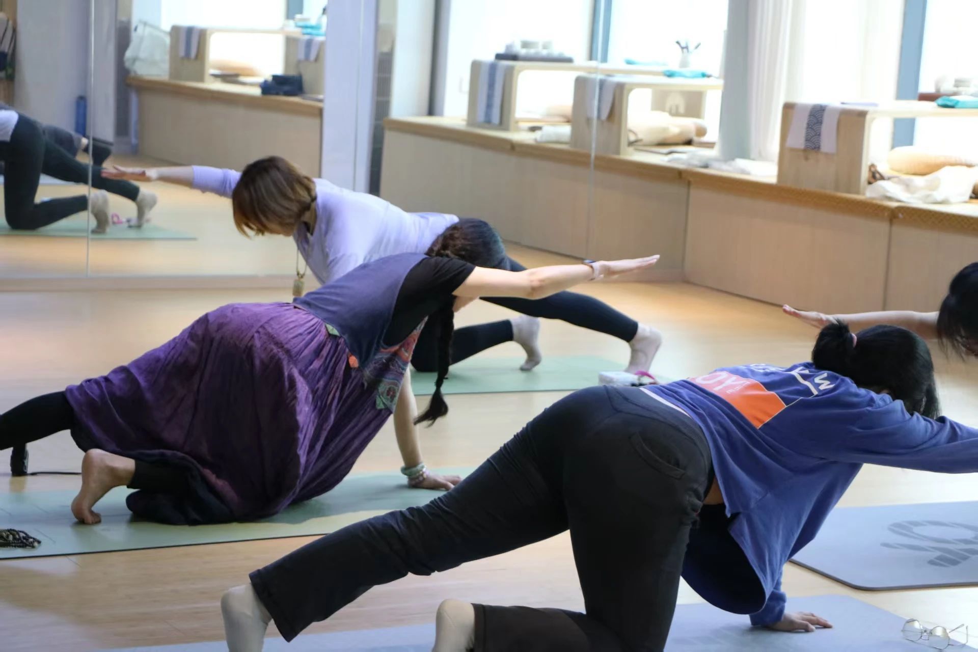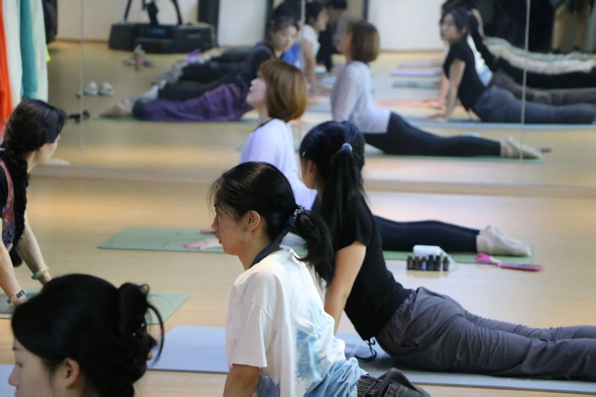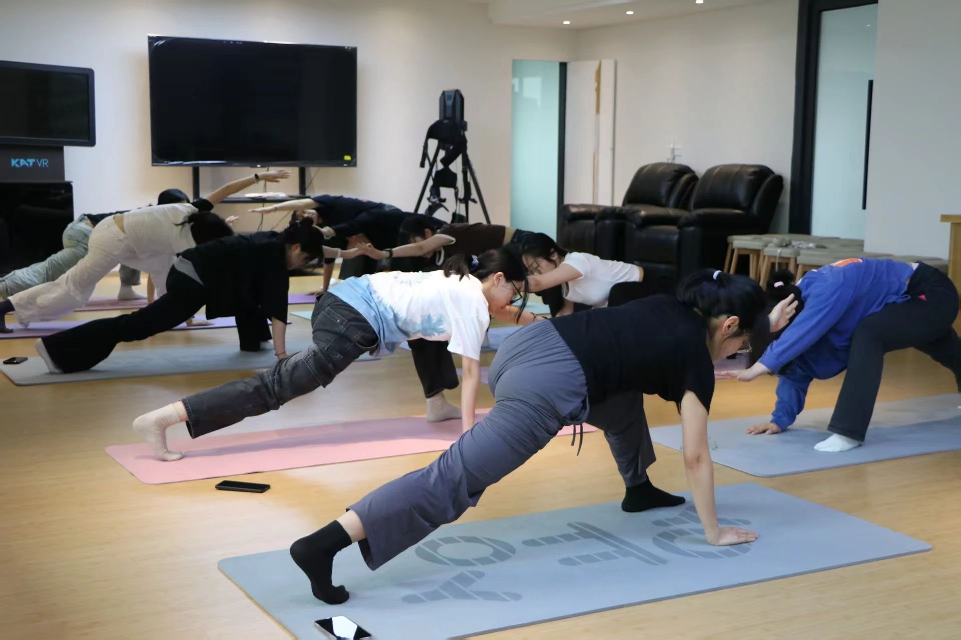 在接下来的体式练习中,课程巧妙设计了既丰富又科学的训练流程。从跪立猫式、下犬式的轻盈热身,到坐角式的优雅延展下肢,再到斜板式的力量凝聚,以及龙式、门栓式的平衡与放松,每一个动作都如同一首诗,循序渐进地引领同学们在锻炼身体柔韧性的同时,也让疲惫的身心得到了温柔的抚慰。