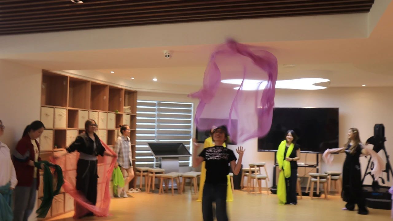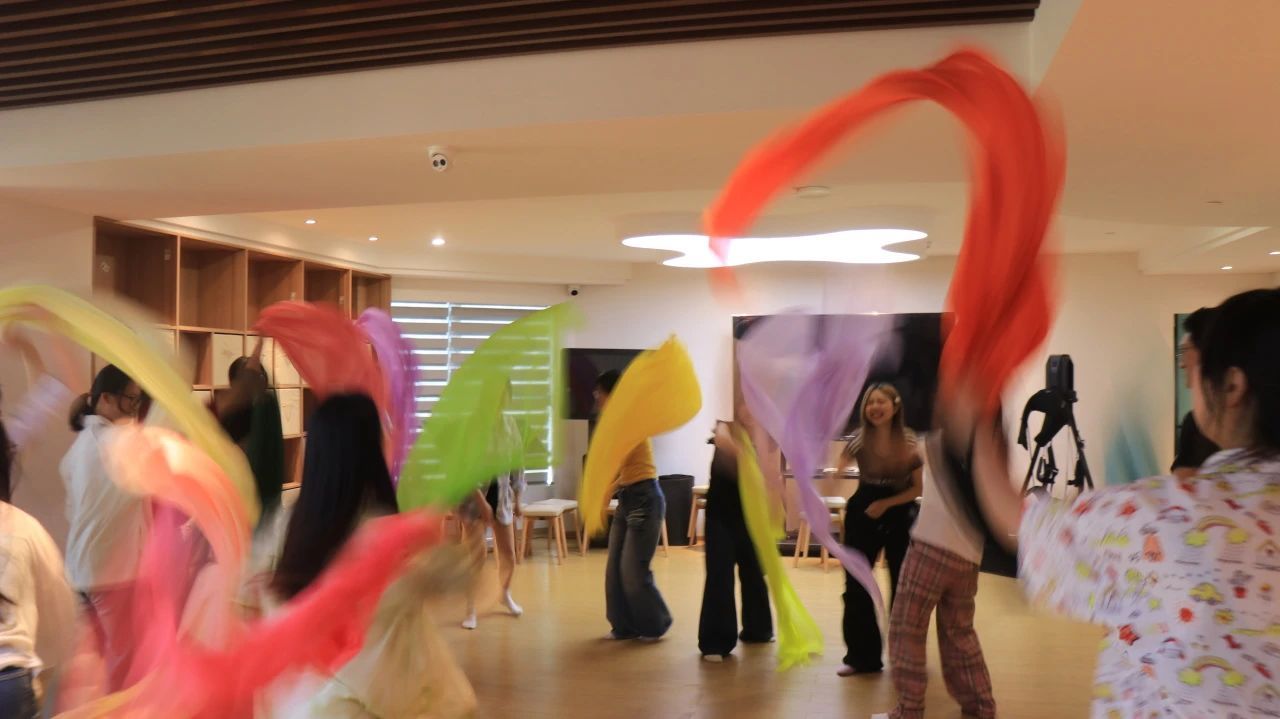 创意环节开始,大家各自选取了一条彩绸,随着音乐响起,每个人走到中间,做一个自己此刻想做的动作,彩绸在空中飘舞,仿佛为每个人的动作增添了一份灵动与色彩,用身体和彩绸编织出一个个美丽的画面。