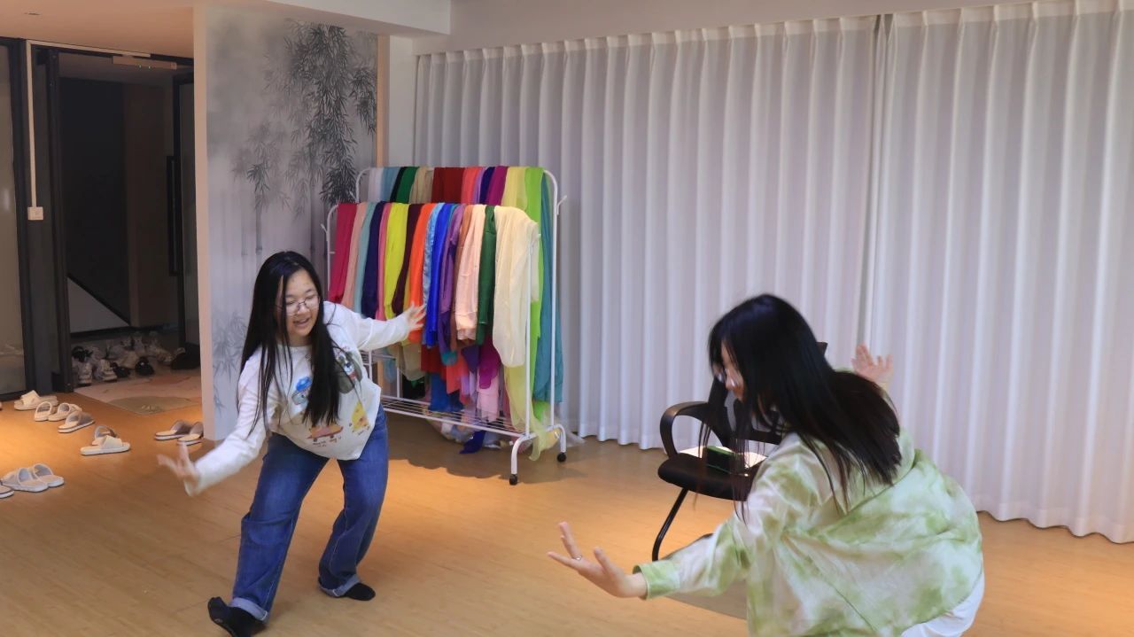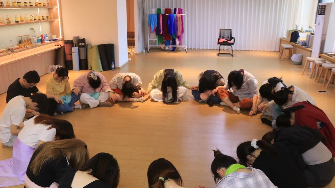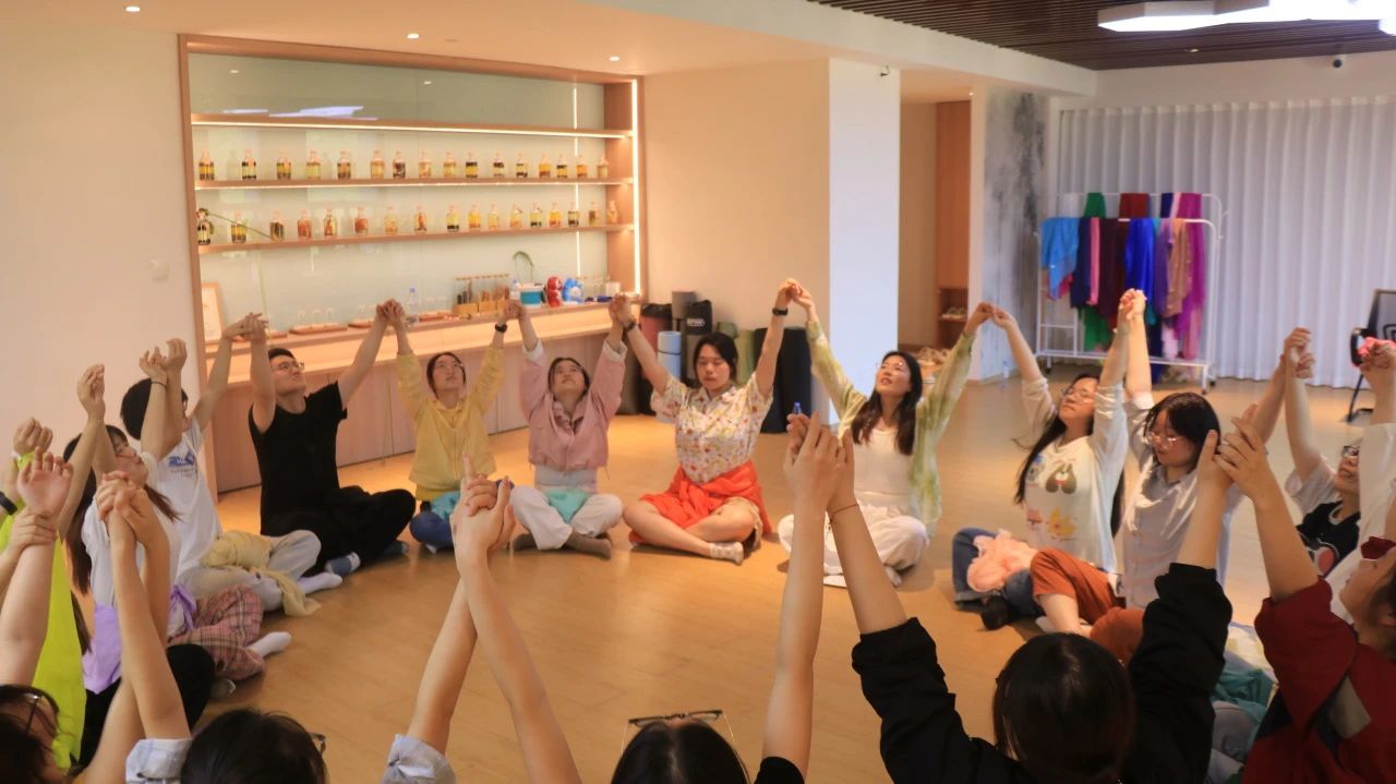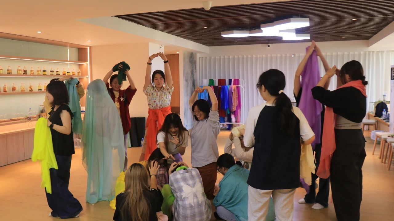 “1、2、3、啊!”所有人齐声呐喊,将手中的丝绸想象成烦恼和焦虑通通抛开,声音在房间里回荡。随后,大家围圈鼓掌并转身,整齐的动作和欢快的节奏让现场充满了活力与激情。