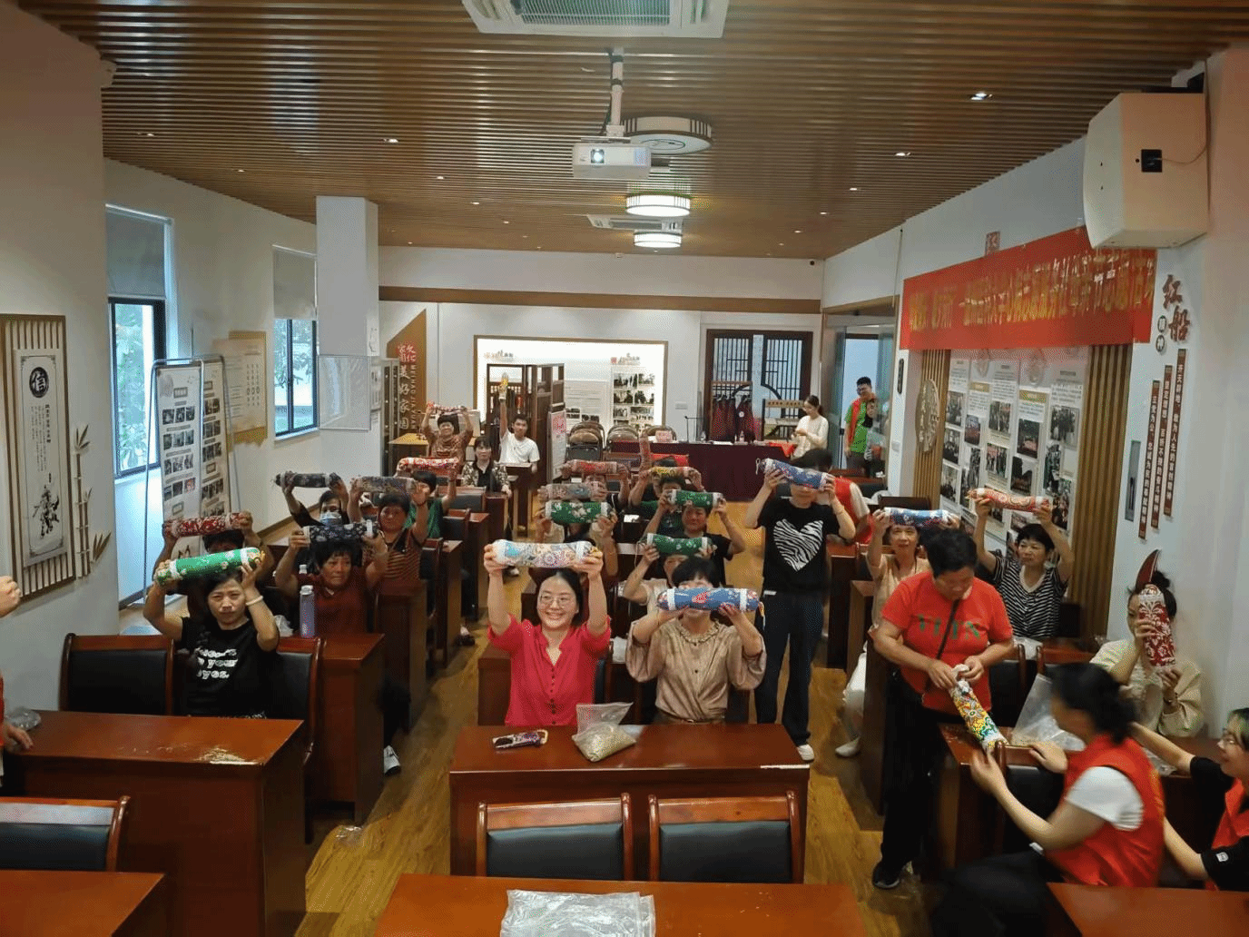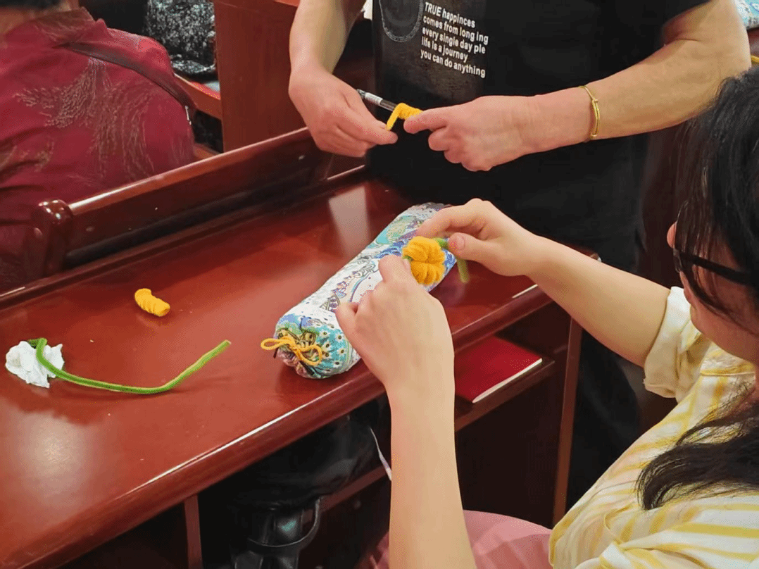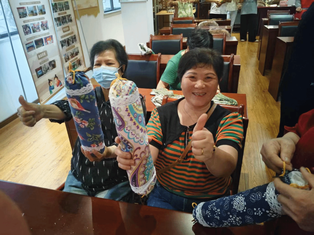 在丹田环放松活动后,公司志愿者们为在场的老人们准备了丰富的艾草中式颈枕制作材料。在志愿者的耐心指导和帮助下,老人们亲手制作属于自己的颈枕。活动中,志愿者们积极协助老人们完成作品,并送上真挚的祝福。这一活动不仅能够提升老人的手眼协调能力,还能通过制作艾草颈枕作品来改善睡眠和健康状态,让老人们享受与同伴交流互动的乐趣。